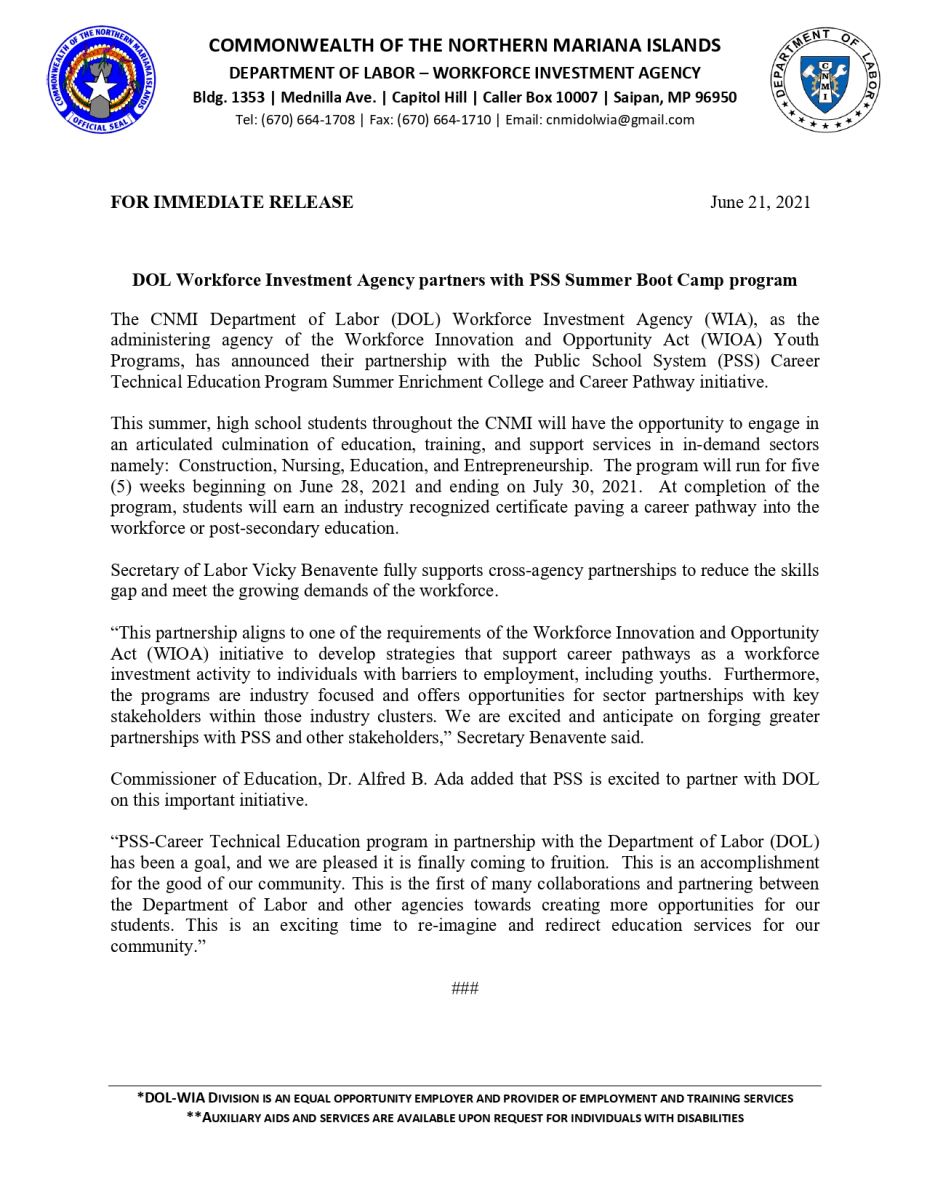 The CNMI State Workforce Development Board and the DOL Workforce Investment Agency Division are Equal Opportunity Employer/provider and that auxiliary aids and services are available upon request to individuals with disabilities. This event is 100% funded through the U.S. Department of Labor Employment and Training Administration Workforce Innovation and Opportunity Act Title 1 Grant totaling $1,537,732.00 for program year 2021.