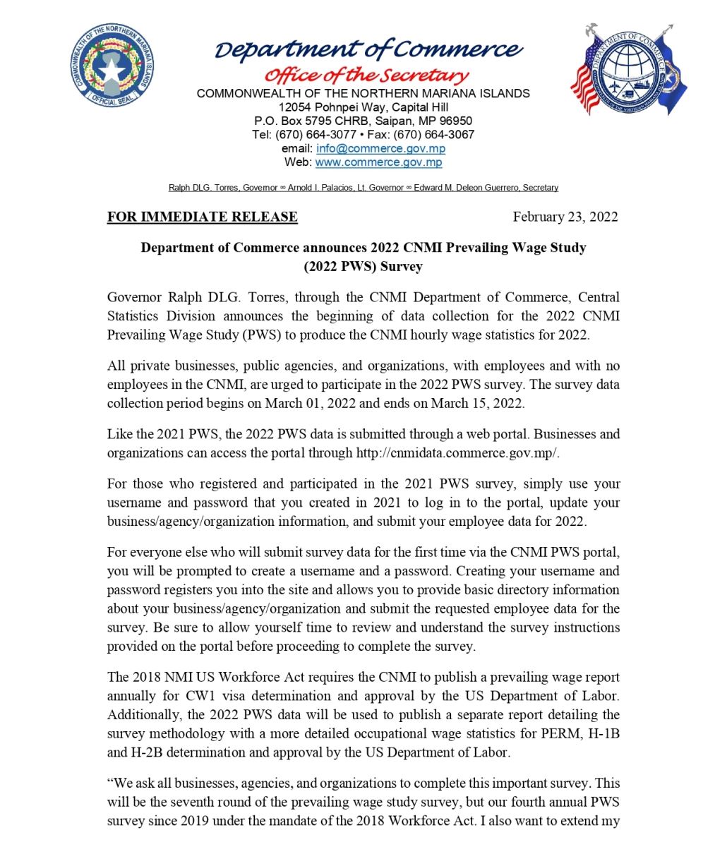 The Department of Labor in the Commonwealth of the Northern Mariana Islands (CNMI DOL) is conducting a survey to understand how the CW-1 visa "touchback policy" is affecting businesses in the region. Questions in this survey were chosen in collaboration with the Saipan Chamber of Commerce.