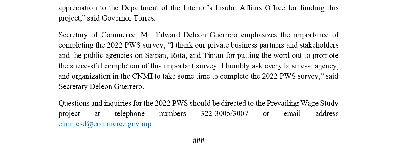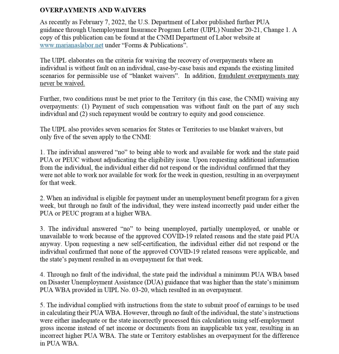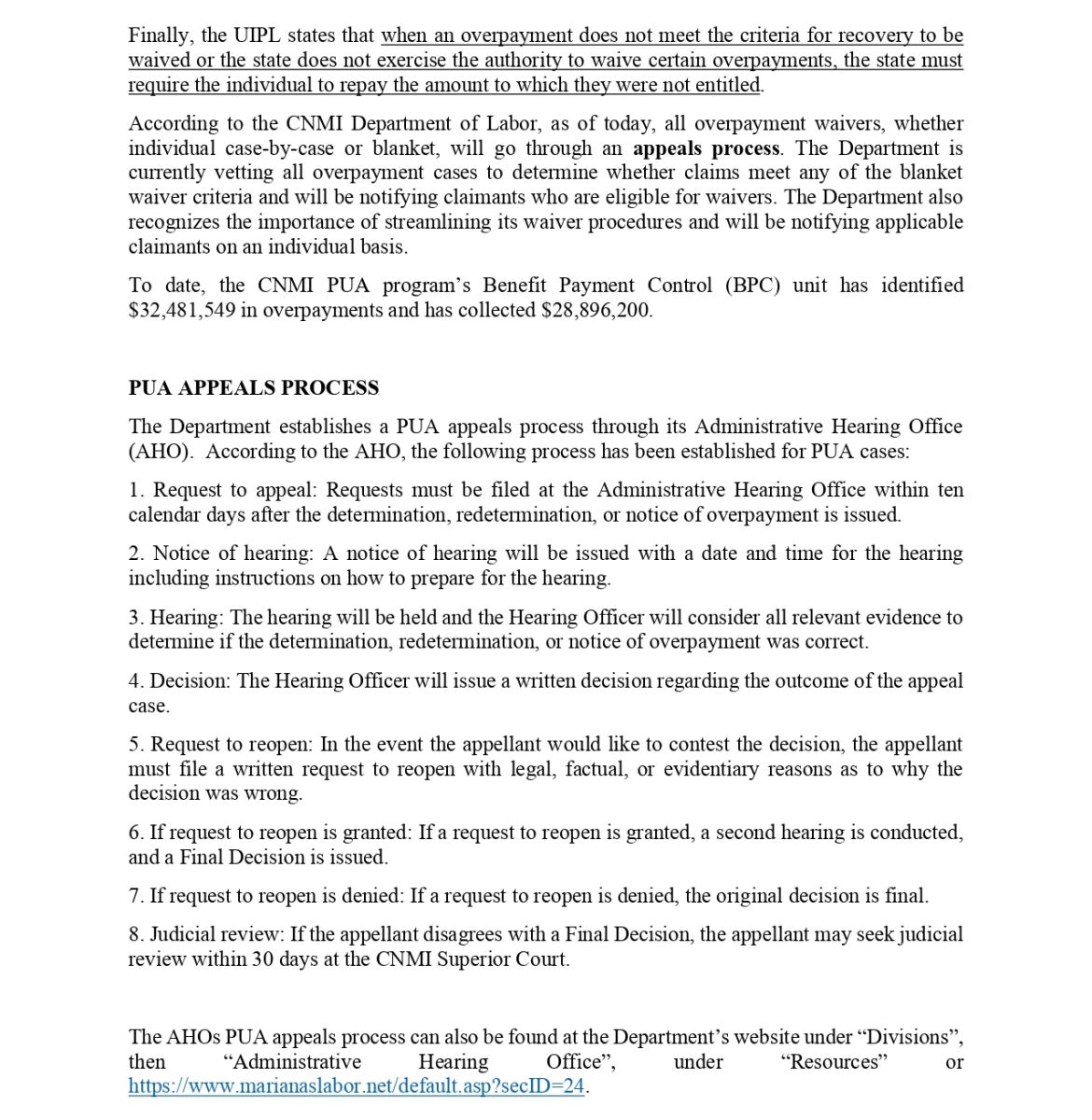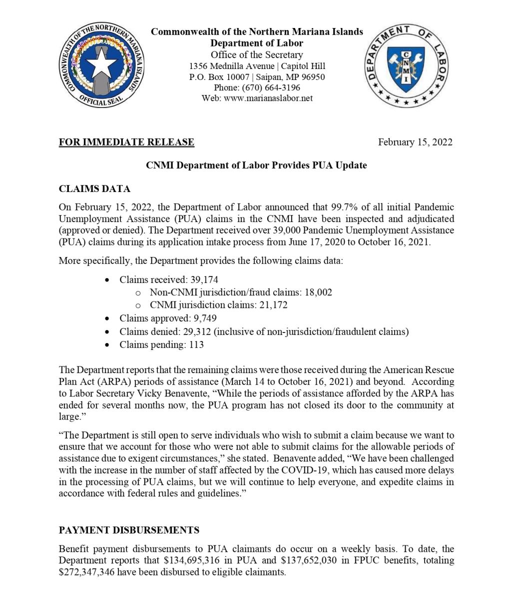 The CNMI Department of Labor (DOL) would like to remind individuals who have received Pandemic Unemployment Assistance (PUA) and Federal Pandemic Unemployment Compensation (FPUC) benefits in the CNMI and were found to have been overpaid to contact DOL to settle the overpayment. In response to the COVID-19 pandemic, the PUA and FPUC programs were established to provide financial support to those who were unemployed, partially unemployed, or unable and/or unavailable to work as a direct result of the pandemic. However, some recipients in the CNMI may have received more benefits than they were eligible for due to several reasons, such as, but not limited to incorrect/incomplete earnings reported, failure to report their return to work or earnings, or withholding of pertinent employment information. Recipients who have received a Notice of Overpayment are encouraged to promptly repay the overpaid balance. To assist in the repayment process, DOL offers options including making a one-time payment, setting up a scheduled repayment plan, or having the overpayment deducted from future PUA benefits, if applicable. To explore your repayment options, please contact the DOL’s Benefit Payment Control (BPC) Unit. It is important for individuals to promptly report any changes as well as provide all required and requested documents to avoid overpayment and future offset of applicable benefits, such as tax refunds or wage garnishments. If you have questions about your PUA benefits or overpayments in the CNMI, please contact the CNMI Department of Labor Benefit Payment Control Unit at (670) 322-9941, (670) 322–9943, or (670) 322-9944 for more information or email bpc.cnmidol@gmail.com.