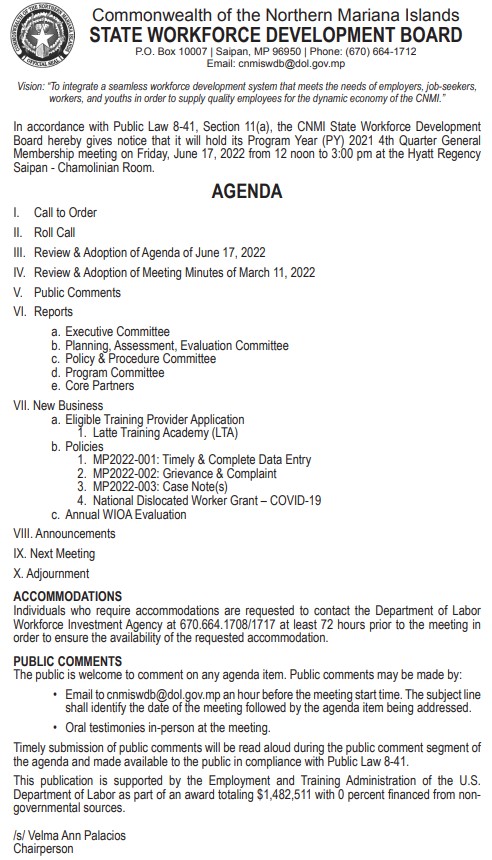 In accordance with Public Law 8-41, Section 11(a), the CNMI State Workforce Development Board hereby gives notice that it will hold its Program Year (PY) 2022 4th Quarter General Membership meeting on June 26, 2023 from 9:00am – 12:00pm at the Hyatt Regency, Giovanni’s Room.